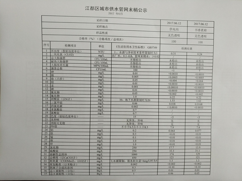 2017年6月江都區城市供水管網末梢公示