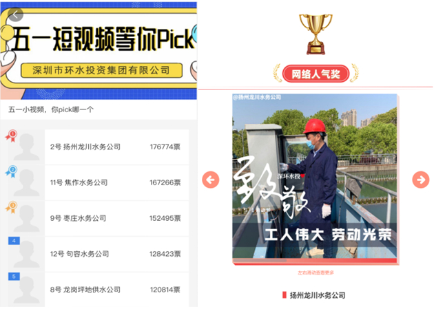 4月30日,揚州龍川水務公司參加了深圳環水投資集團借助新媒體傳播渠道舉辦的“抗疫保民生、致敬奮斗者”五一短視頻征集和系列宣傳投票活動。