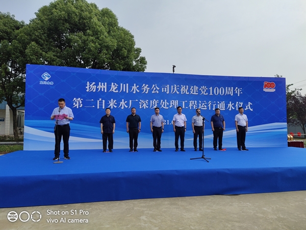6月29日上午,在喜迎中國共產黨百年華誕之際,揚州龍川水務公司在第二自來水廠隆重舉行深度處理工程運行通水儀式。江都區副區長楊曉榮、發改委副主任王安國、住建局副局長高翔宇、水務局副局長高寅峰、衛健委副主任劉俊杰,以及揚州龍川控股集團黨委書記、董事長朱成勇,黨委副書記、總經理高鵬應邀出席活動。龍川控股集團各單位代表、龍川水務全體領導班子成員、中層干部及其下屬各單位三級以上管理人員、全體黨員以及工程建設、施工、監理單位代表170余人參加了運行通水儀式。
